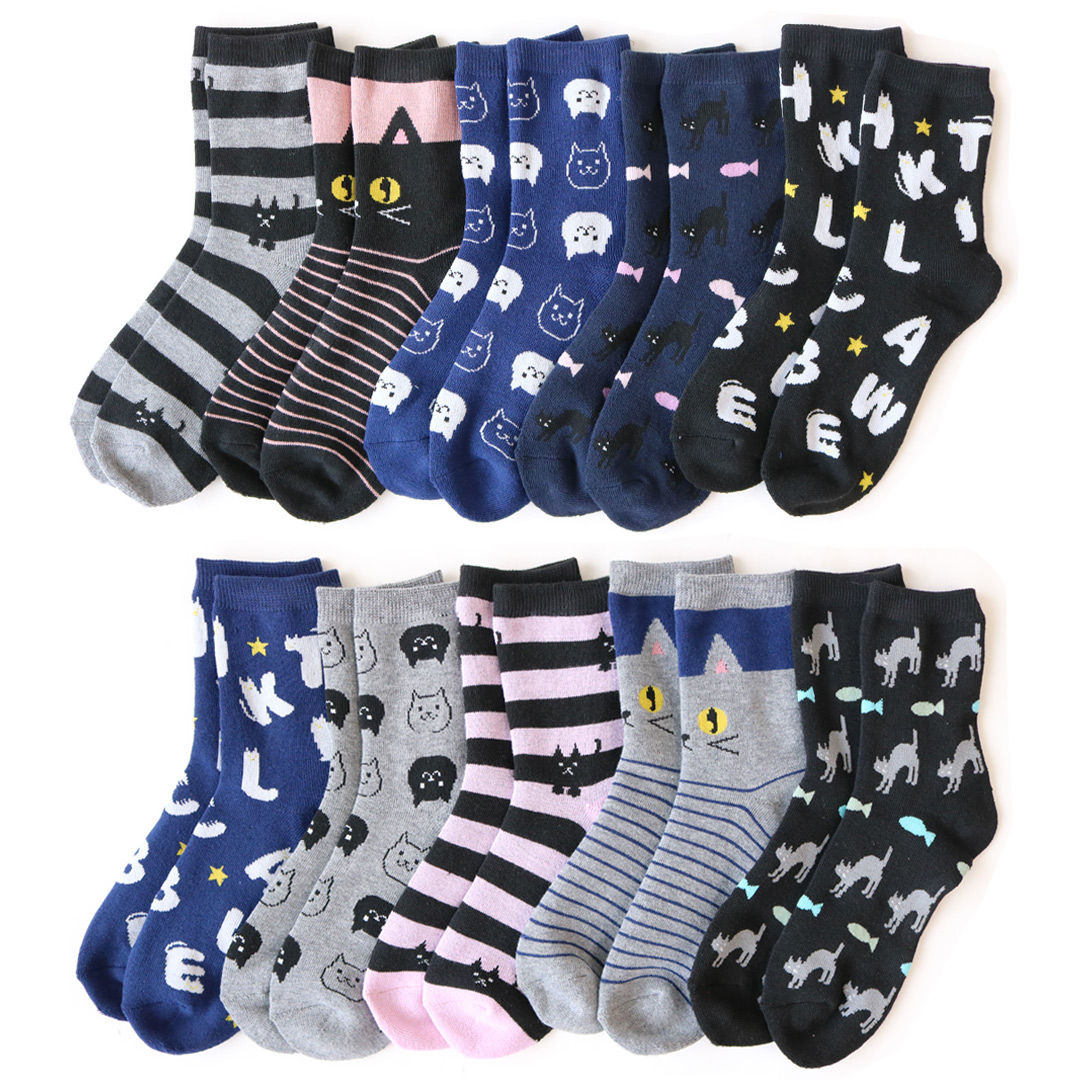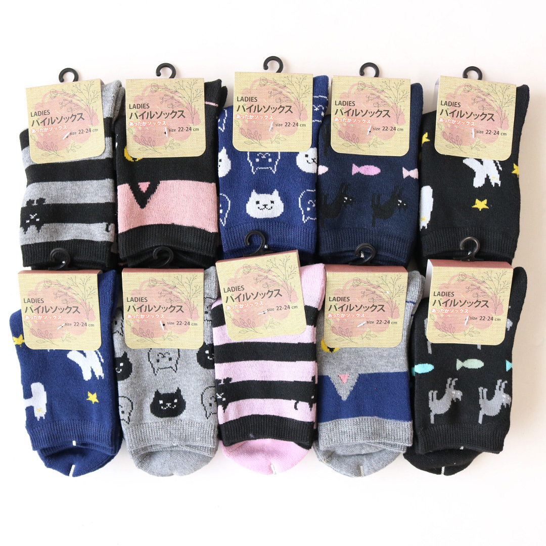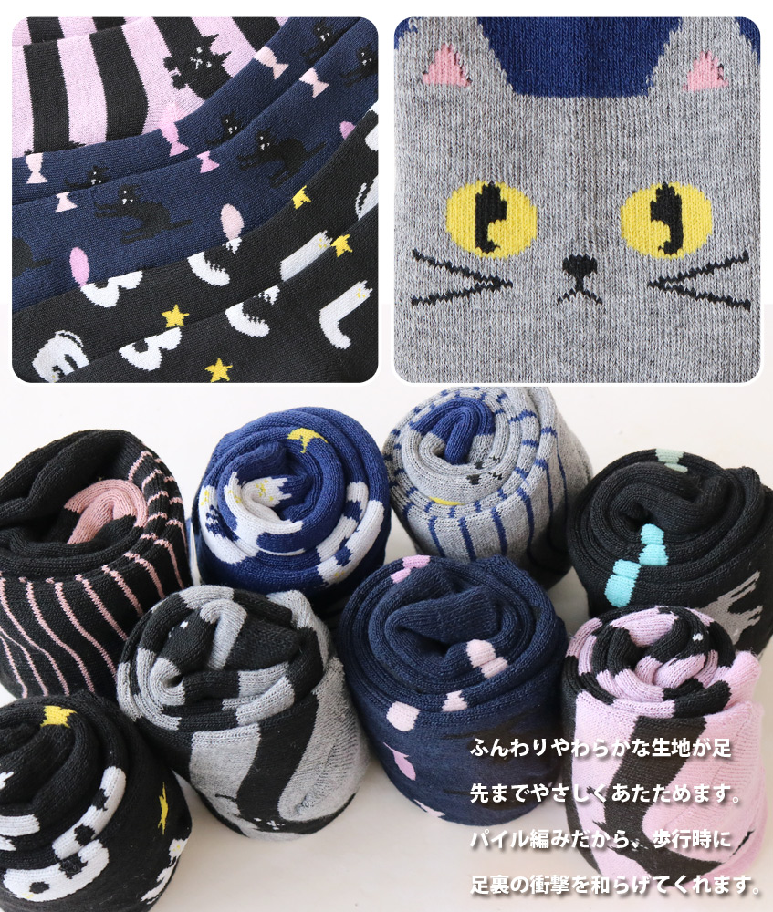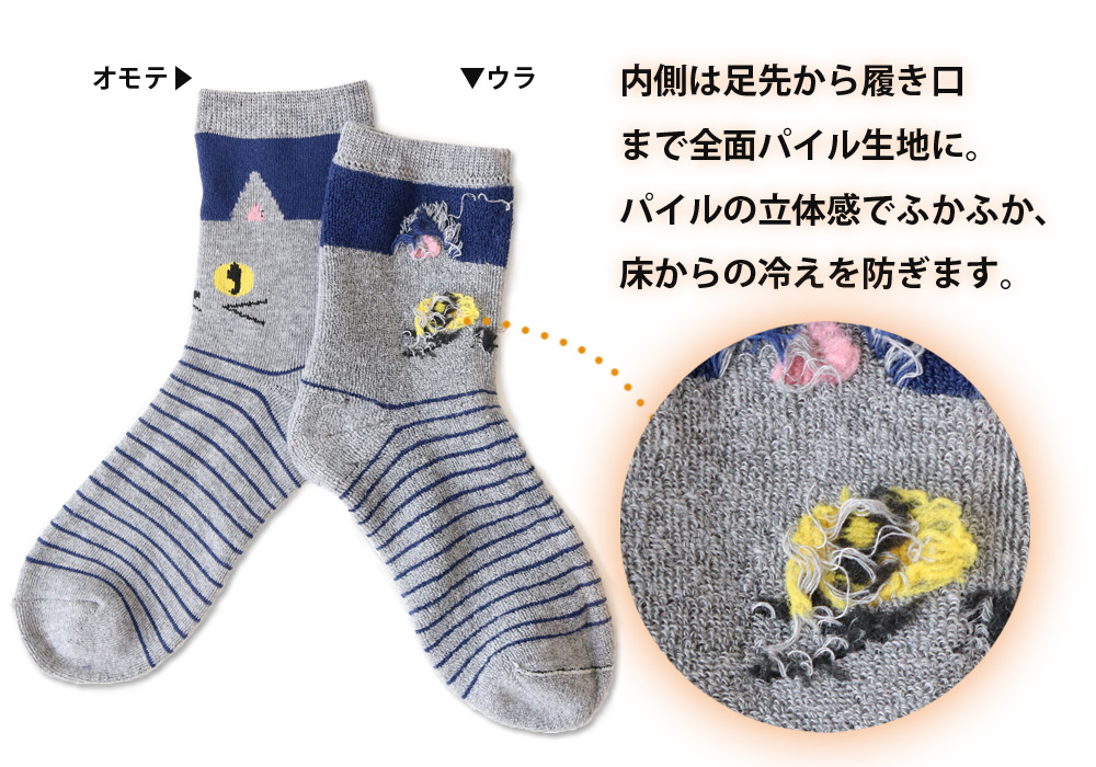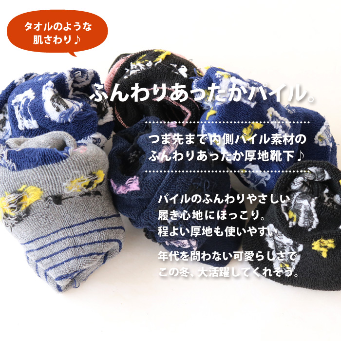 【ふんわりタオルのような肌さわり☆】 婦人 あったか裏パイルクルー丈ソックス ねこ柄