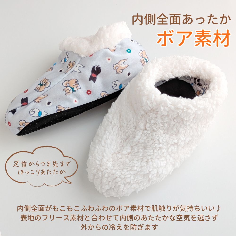 内側はボア、外側はフリースの2重構造。内側の温かな空気は逃さず、外側の寒い空気をシャットアウト。つま先から足首までみっちり詰まったもこもこボアが、足元をふんわり包みます♪